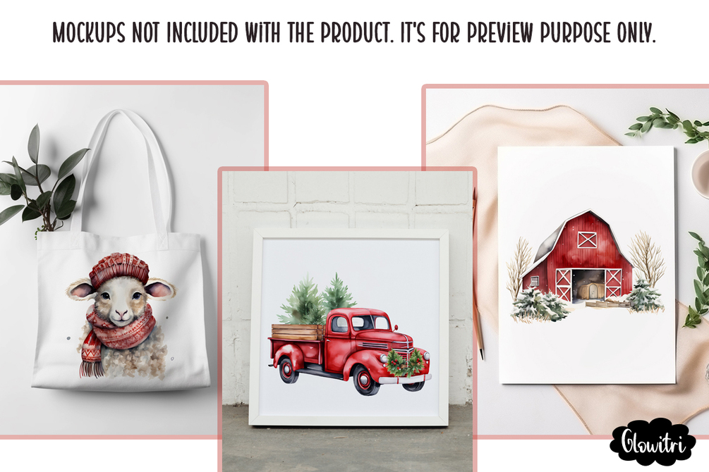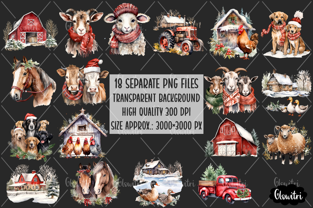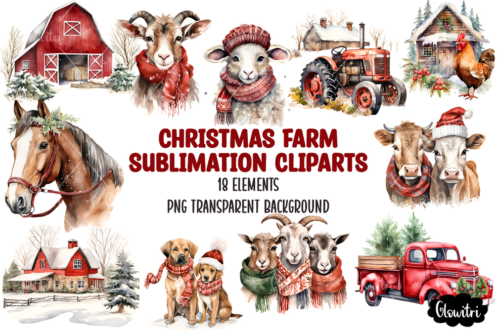 This beautiful christmas Farm sublimation clipart set includes 18 cliparts in PNG format with transparent background.